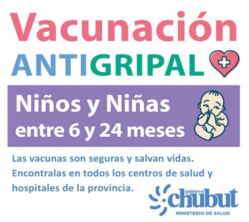 El Gobierno del Chubut, a través del Ministerio de Salud provincial, solicitó a las familias que lleven a los niños y las niñas de 6 a 24 meses de edad a los hospitales y centros de salud de la provincia a vacunarlos contra la Gripe, ante el aumento de casos de enfermedades respiratorias en esta franja etaria registrado durante las últimas semanas.